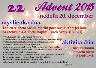 Len čo Alžbeta začula Máriin pozdrav, dieťa v jej lone sa zachvelo a Alžbetu naplnil Duch Svätý. (Lk 1,41)
