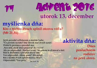 Išiel k druhému a povedal mu to isté. Ten odpovedal: ‚Idem, pane!‘ Ale nešiel. Kto z týchto dvoch splnil otcovu vôľu?“