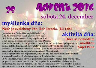 A ty, chlapček, budeš sa volať prorokom Najvyššieho: pôjdeš pred tvárou Pána, pripravíš mu cestu a poučíš jeho ľud o spáse, že mu náš Boh z hĺbky svojho milosrdenstva odpustí hriechy. Tak nás Vychádzajúci z výsosti navštívi a zažiari tým, čo sedia vo tme a v tôni smrti, a naše kroky upriami na cestu pokoja.“